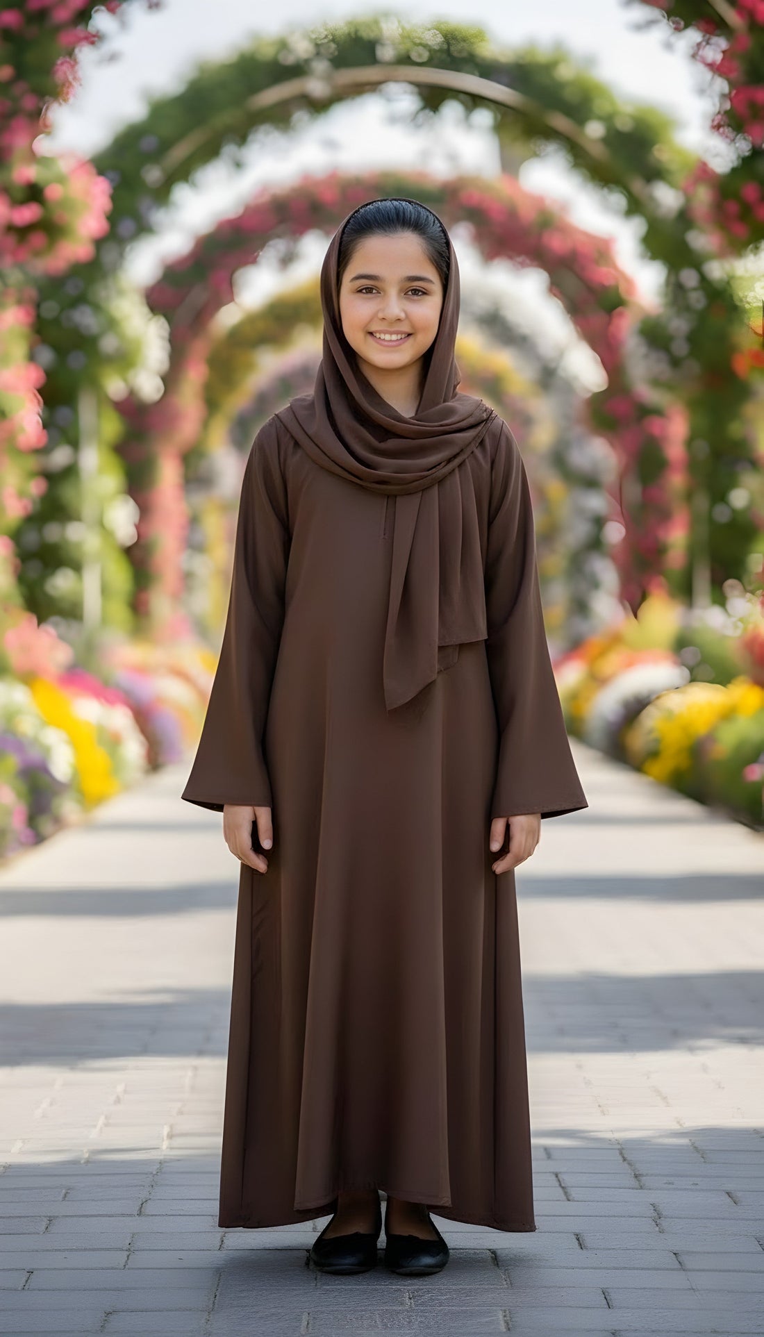 Grace meets sophistication in this serene brown abaya, crafted from premium textured Zoom Nidha adorned...