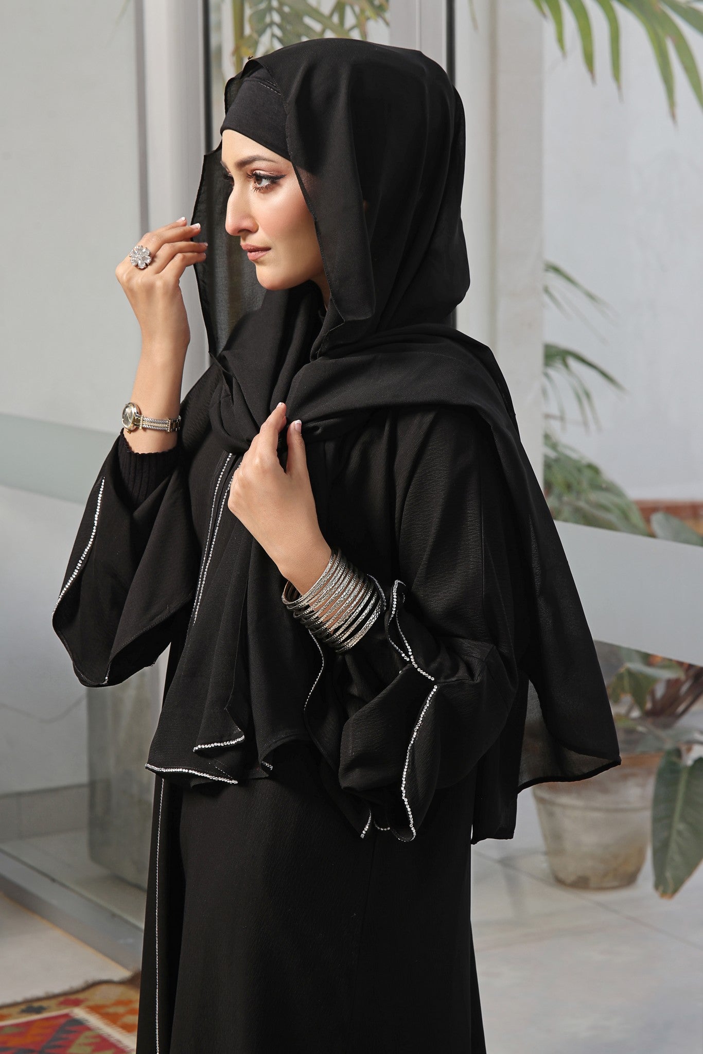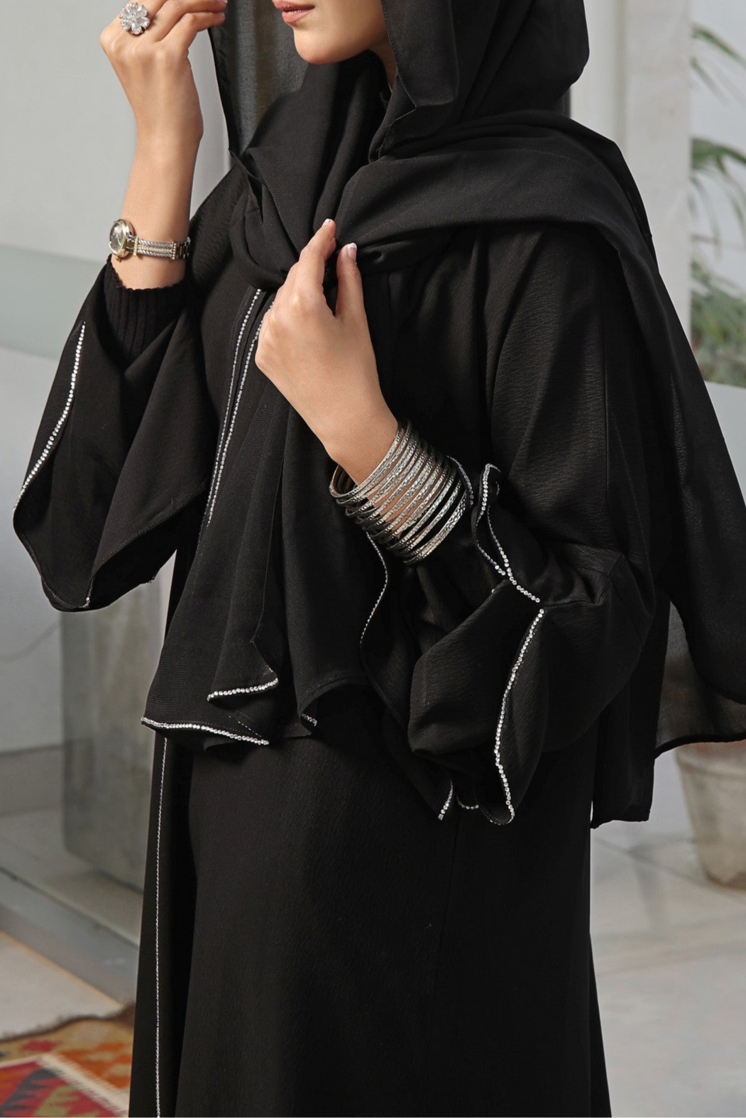 Our beautiful front open bell shape style abaya along with stonework with triple layer is a popular one these days stone work all over front makes it super gorgeous whenever you wear comes along with pure Korean chiffon matching Sheila