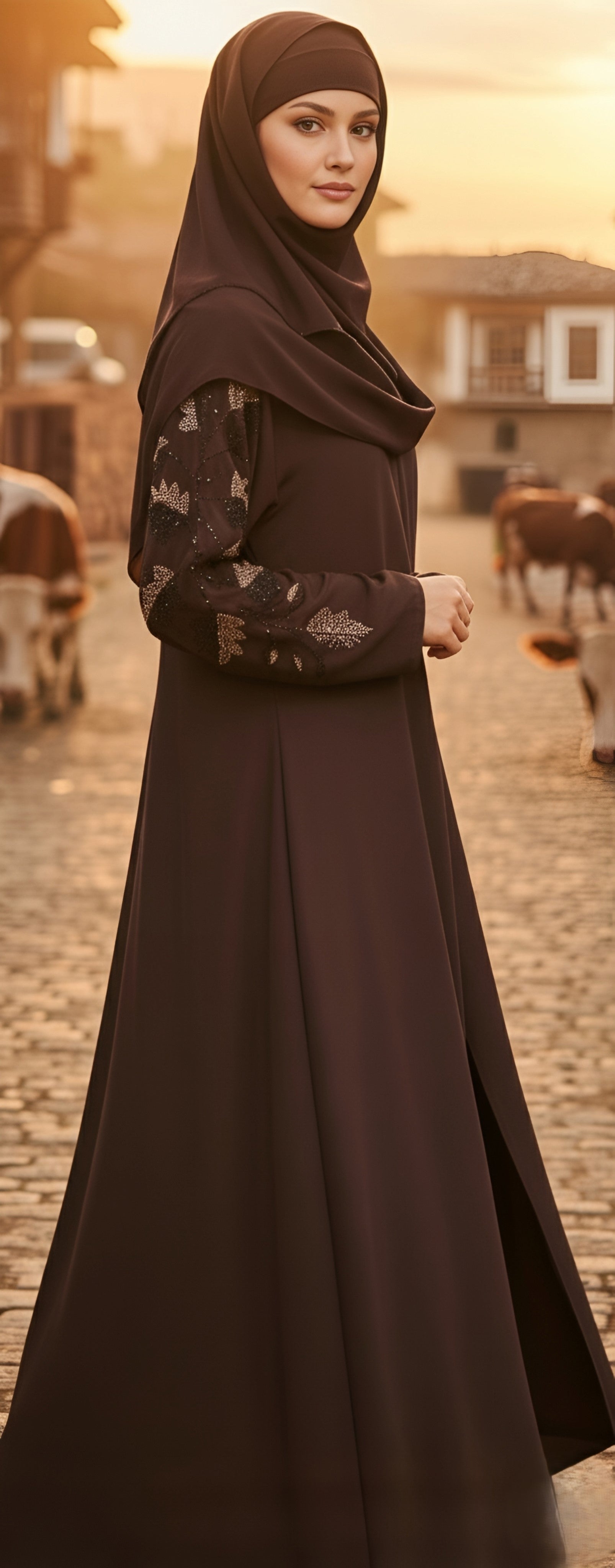 Comfort & Style Combined: Premium fabric ensures ease of movement while maintaining an elevated appearance. Turn heads with this stunning brown abaya—where timeless tradition meets contemporary sophistication through intricate hand-applied stonework in a delicate leaf motif.