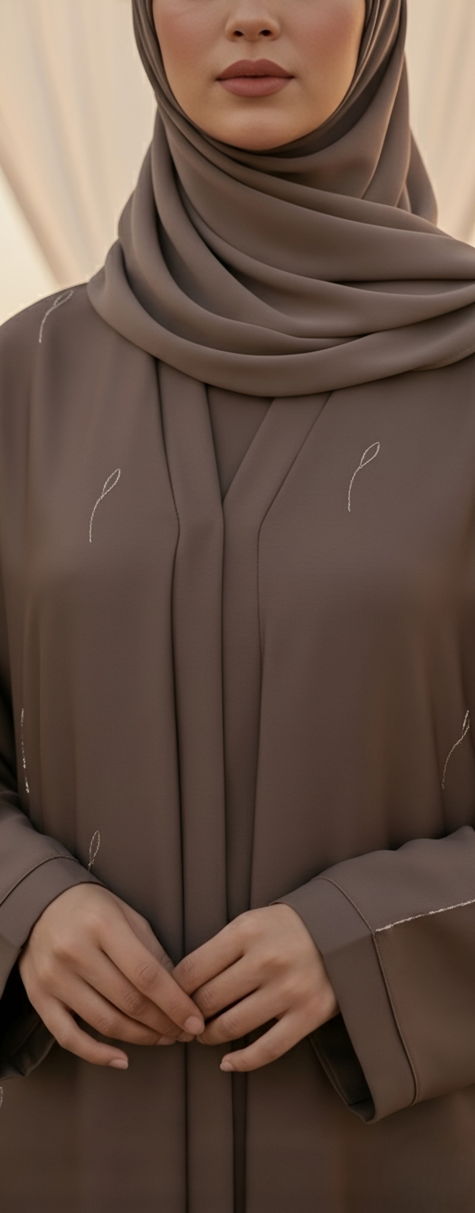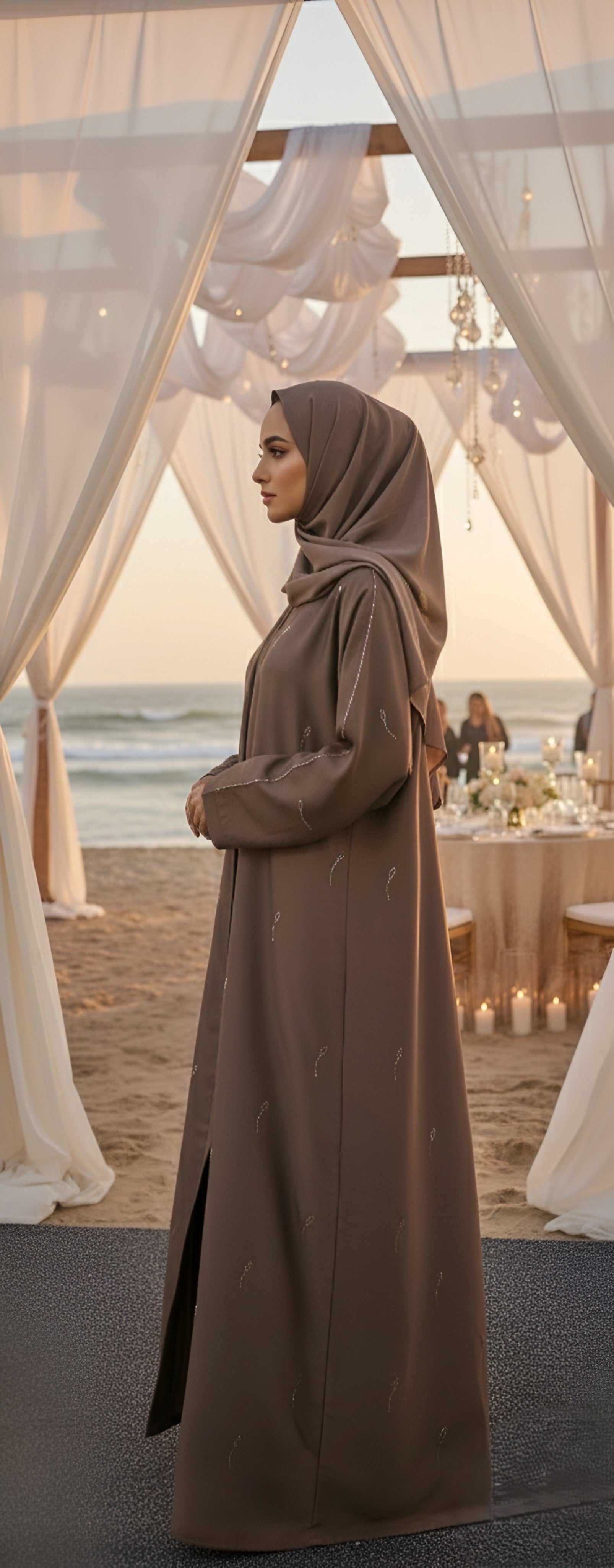 Inspired by the calm tones of dusk, Brown Muse embodies effortless elegance. Crafted from soft, flowy Nidha fabric, this abaya features delicate crystal embellishments that shimmer subtly in the light — perfect for refined evenings and serene gatherings by the sea.