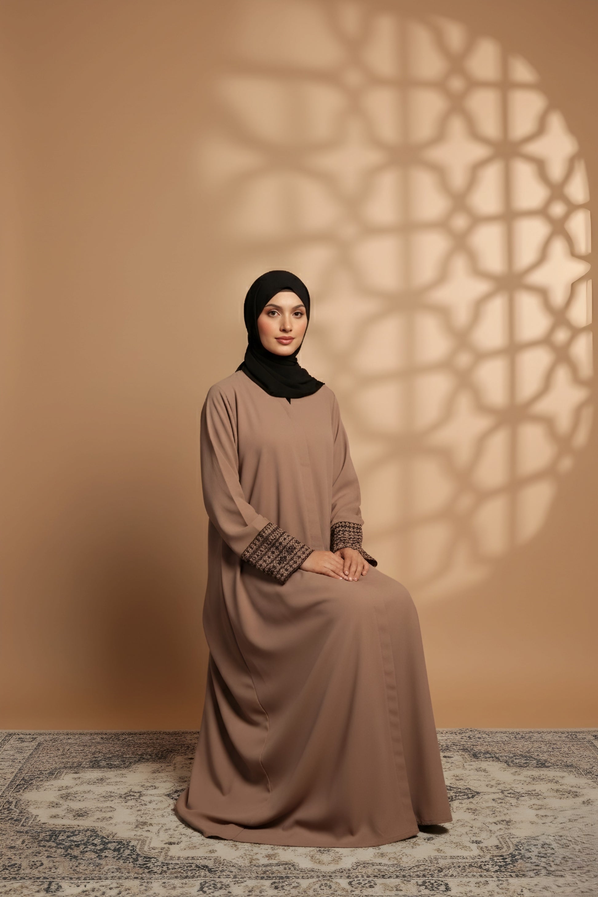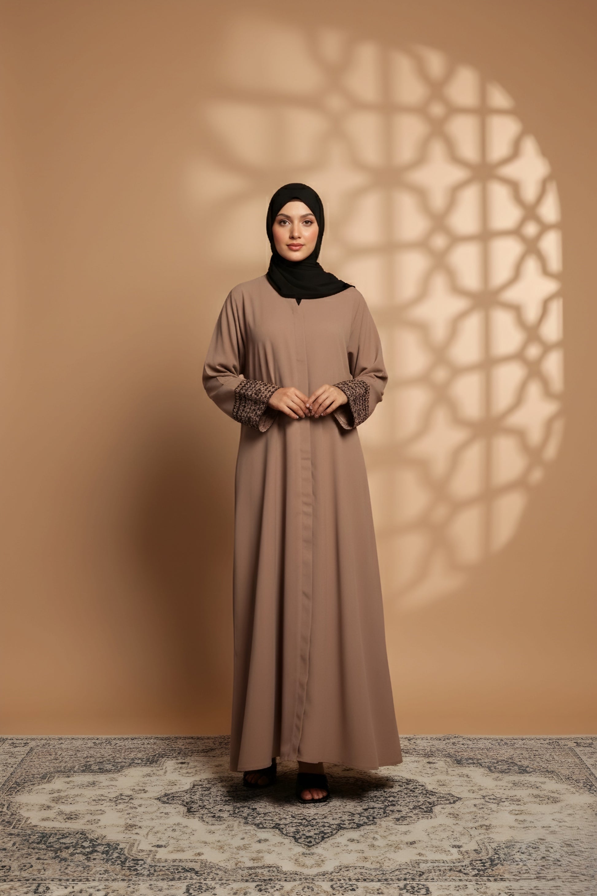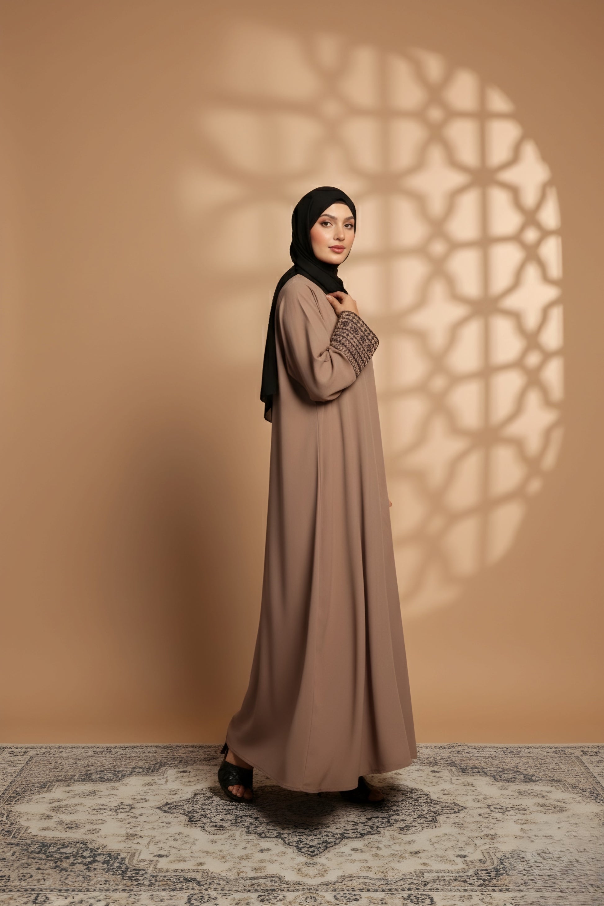 - Beige Color: A rich and elegant shade that enhances the regal appeal of this abaya.