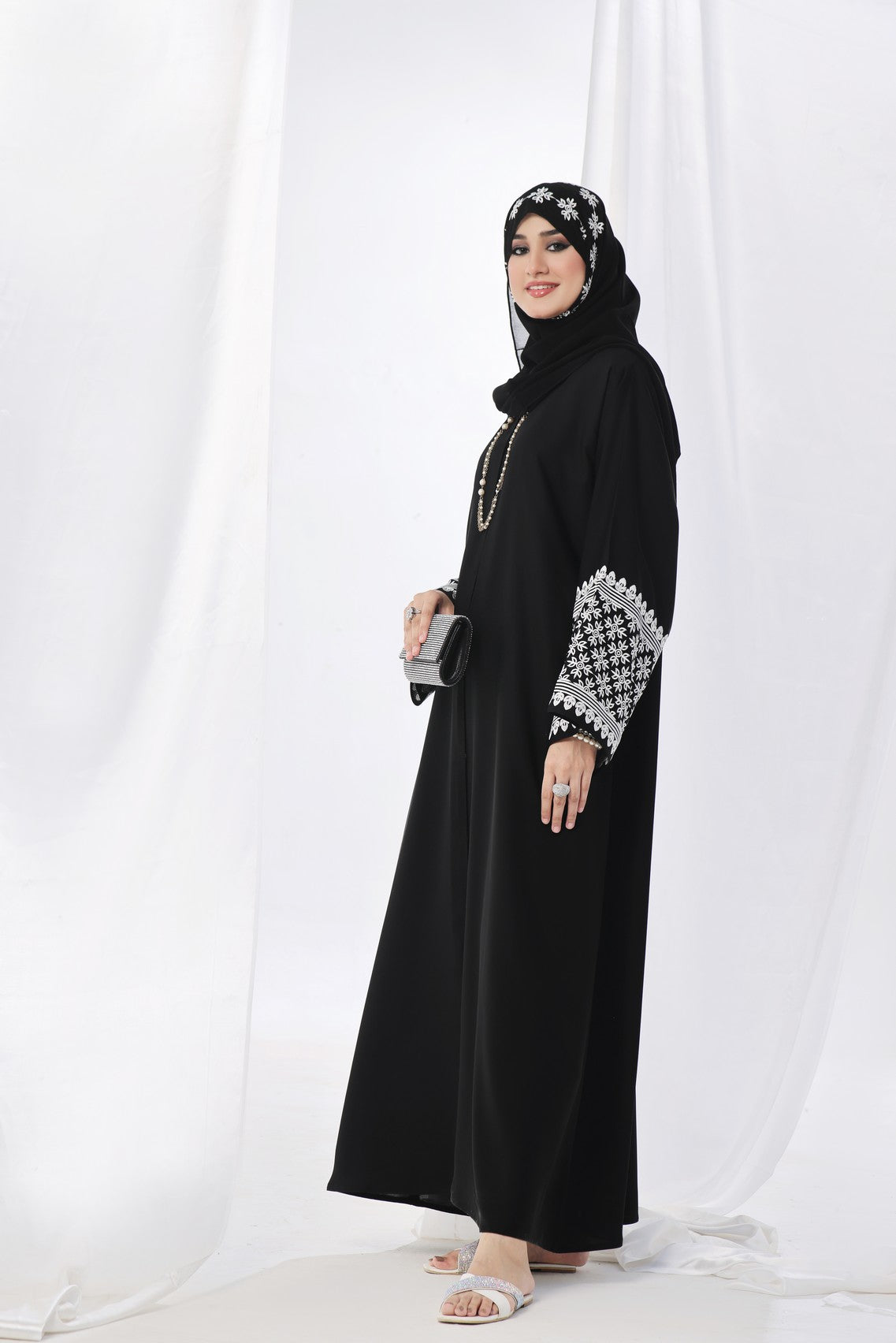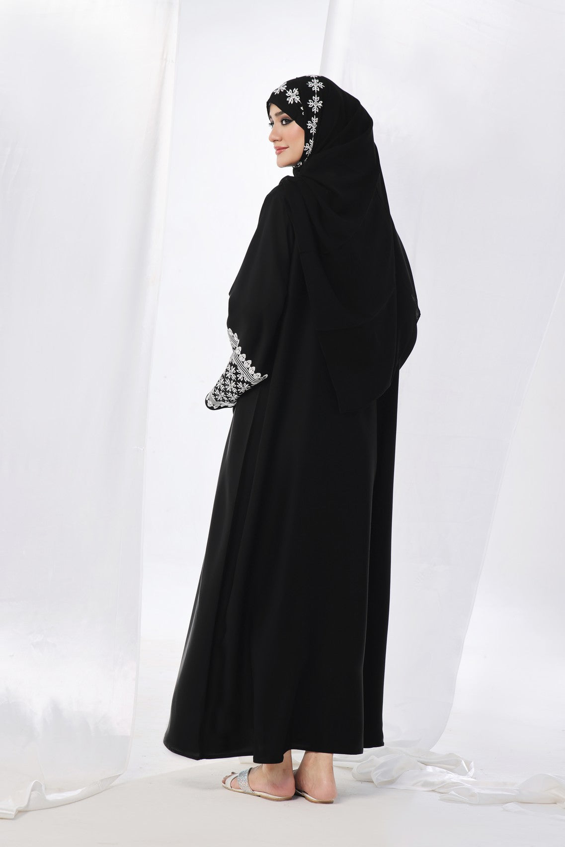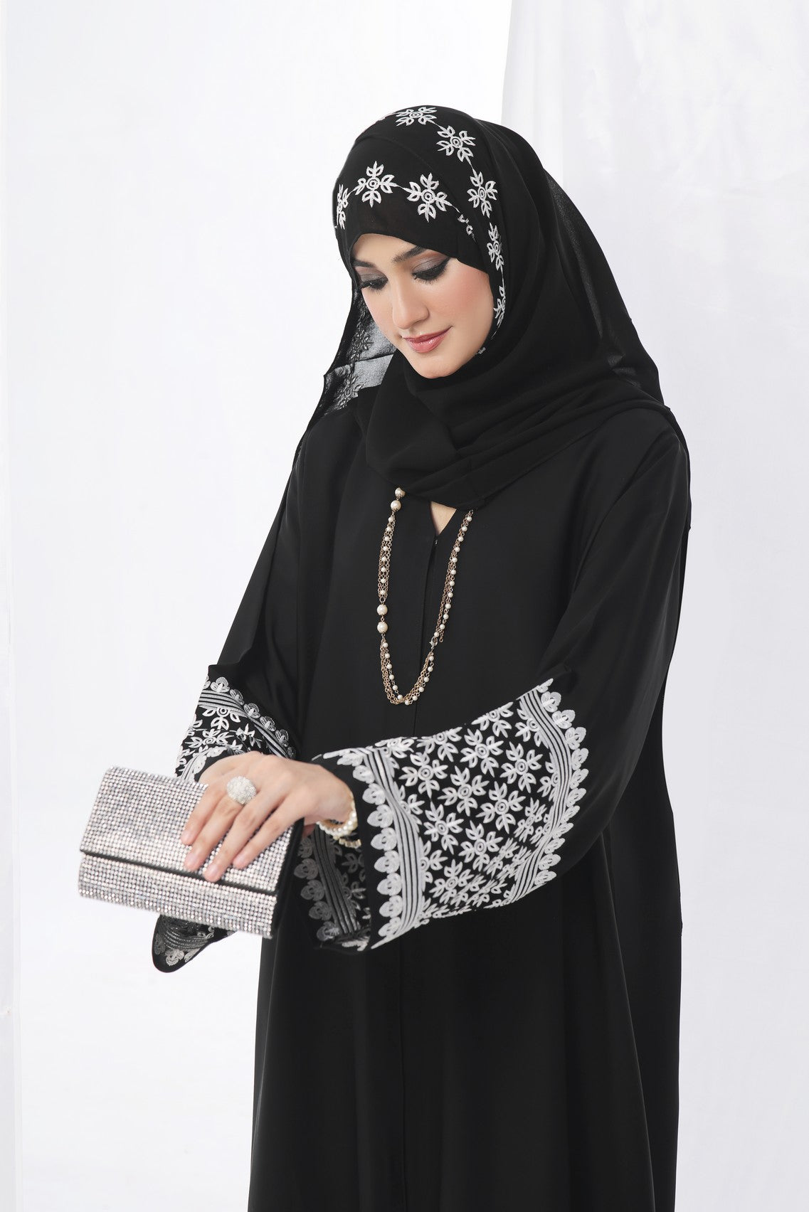 • White Thread Embroidery on Sleeves and Hijab: Beautifully crafted embroidery adds a striking contrast and artistic touch.
