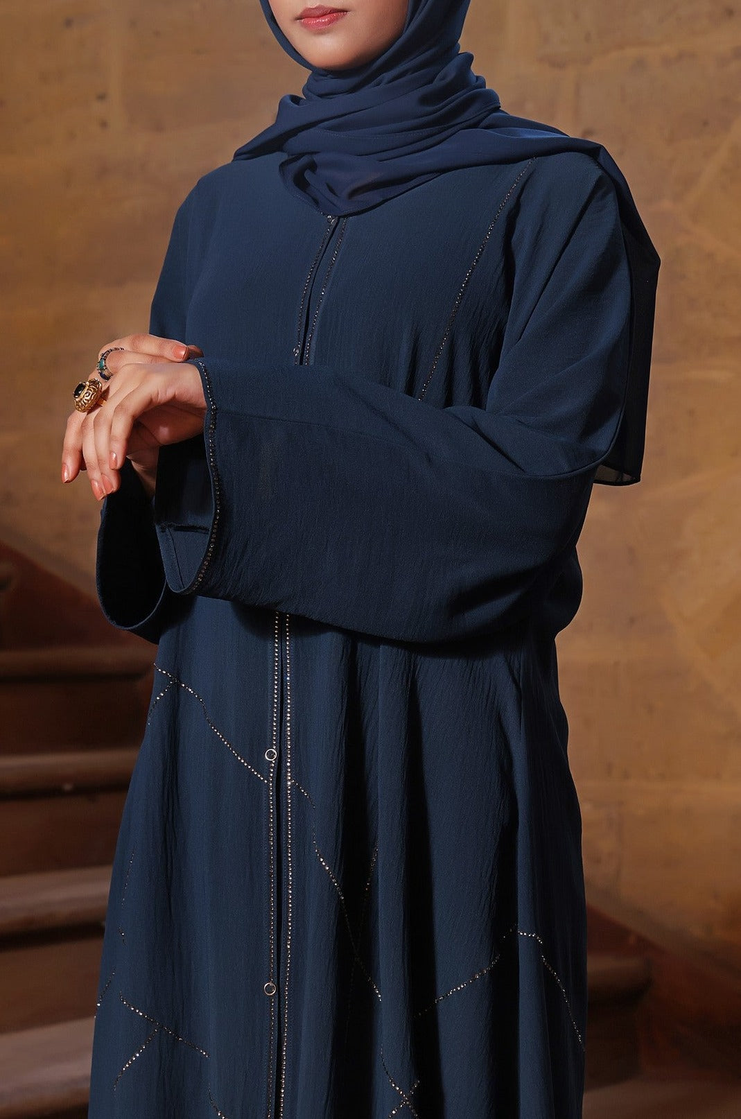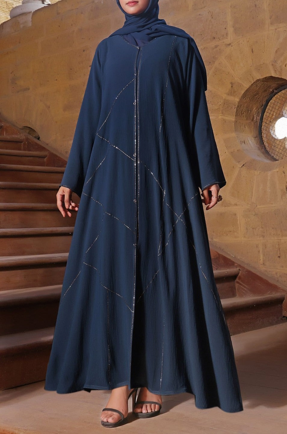 Our beautiful front open style abaya is a popular one these days stone work all over front makes it super gorgeous whenever you wear comes along with pure Korean chiffon matching Sheila