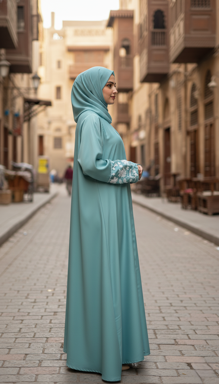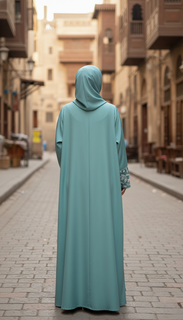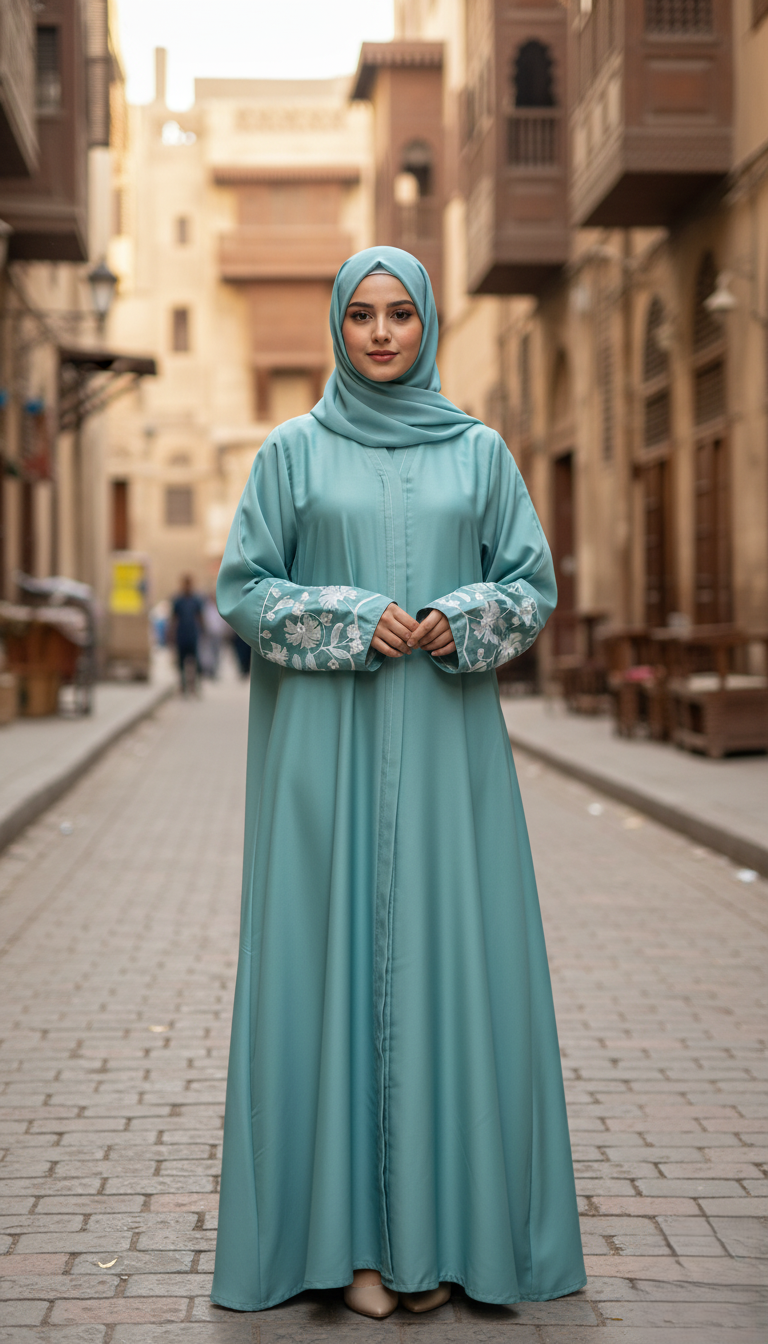 Illuminate your style with the Midnight Glow Abaya. This chic, open-front design flows beautifully in a serene seafoam green (or aqua) shade. The sleeves feature stunning, high-contrast white floral embroidery, adding a touch of exquisite artistry to this otherwise minimalist piece. Perfect for special occasions or elevating your everyday look, the Midnight Glow offers comfort, coverage, and unforgettable elegance.