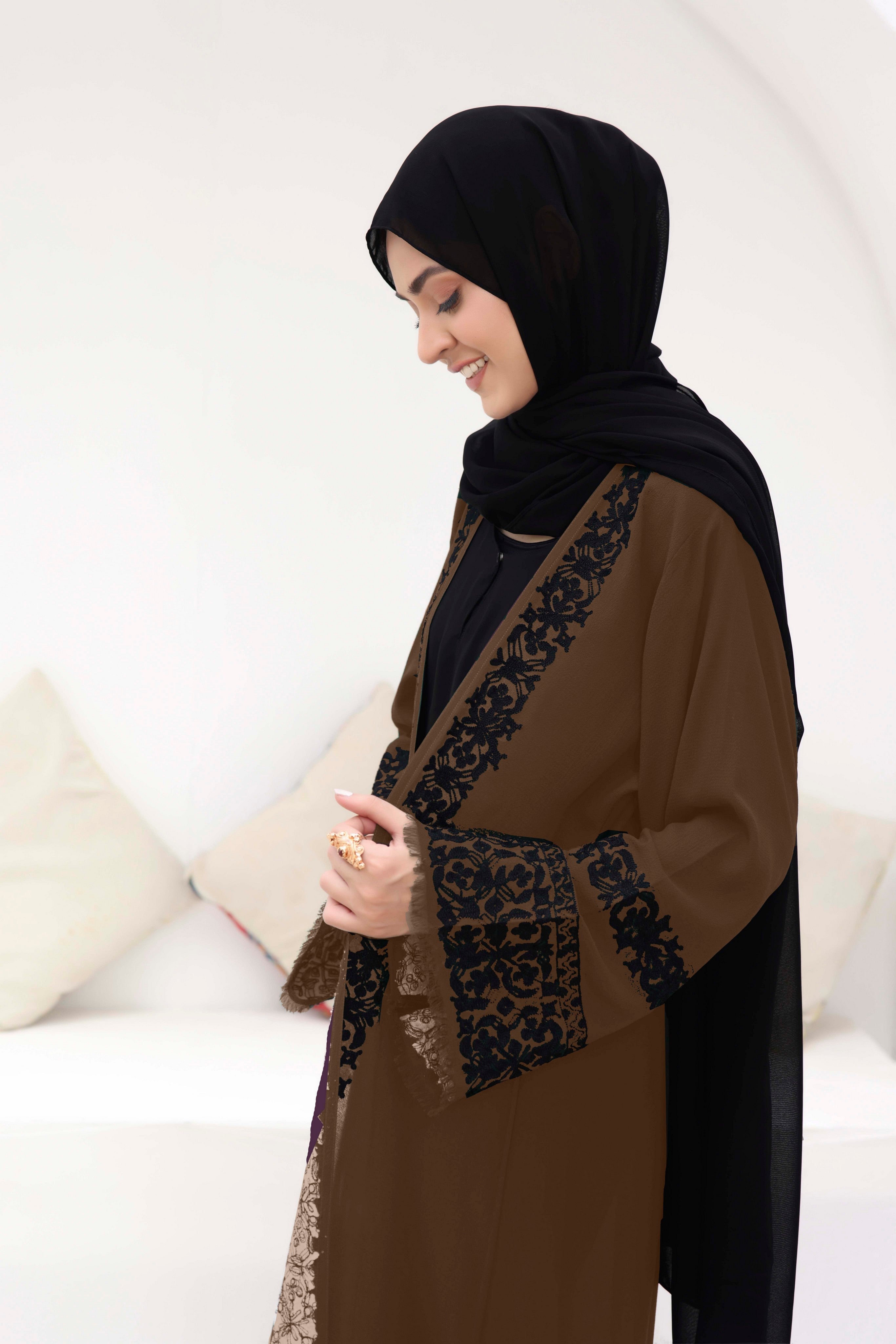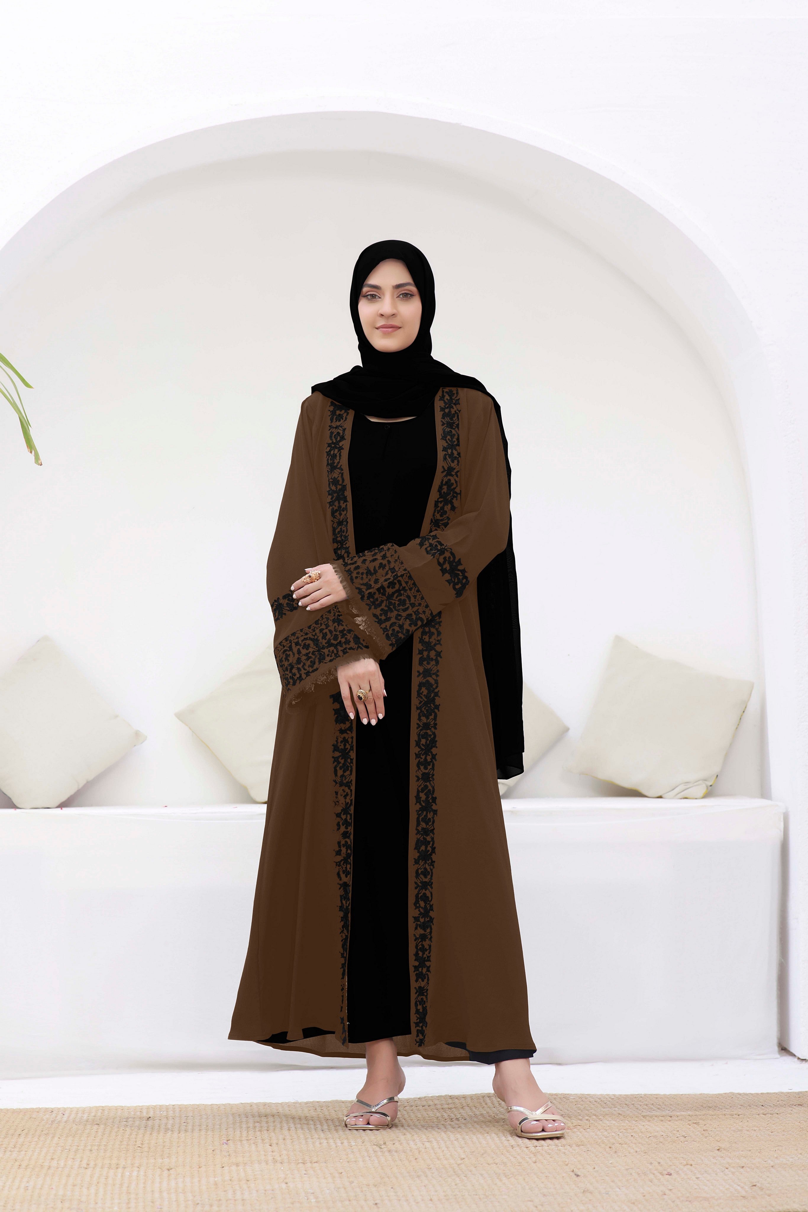 Add this stunning coat-style abaya to your collection for a look that effortlessly balances modern design and timeless elegance.