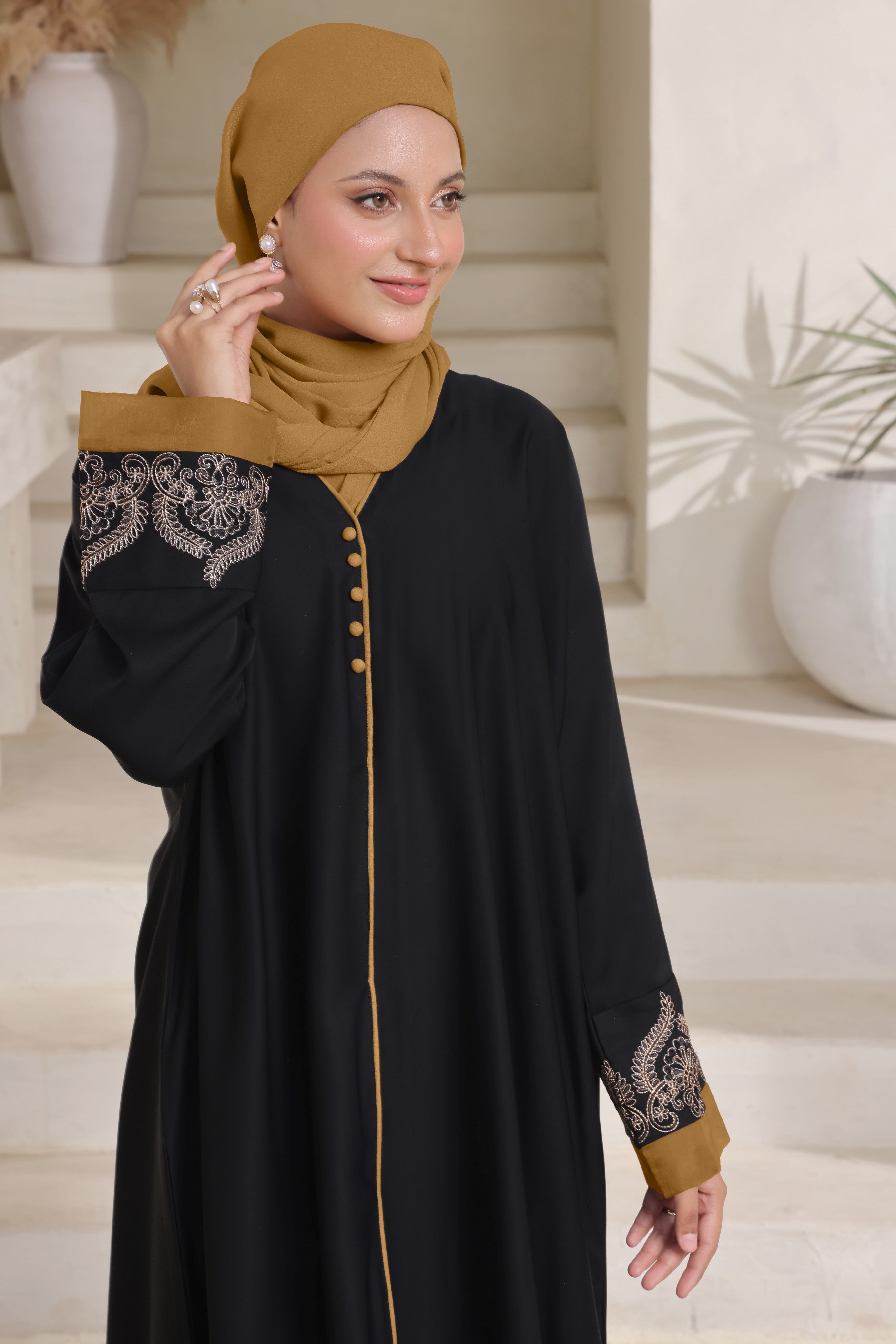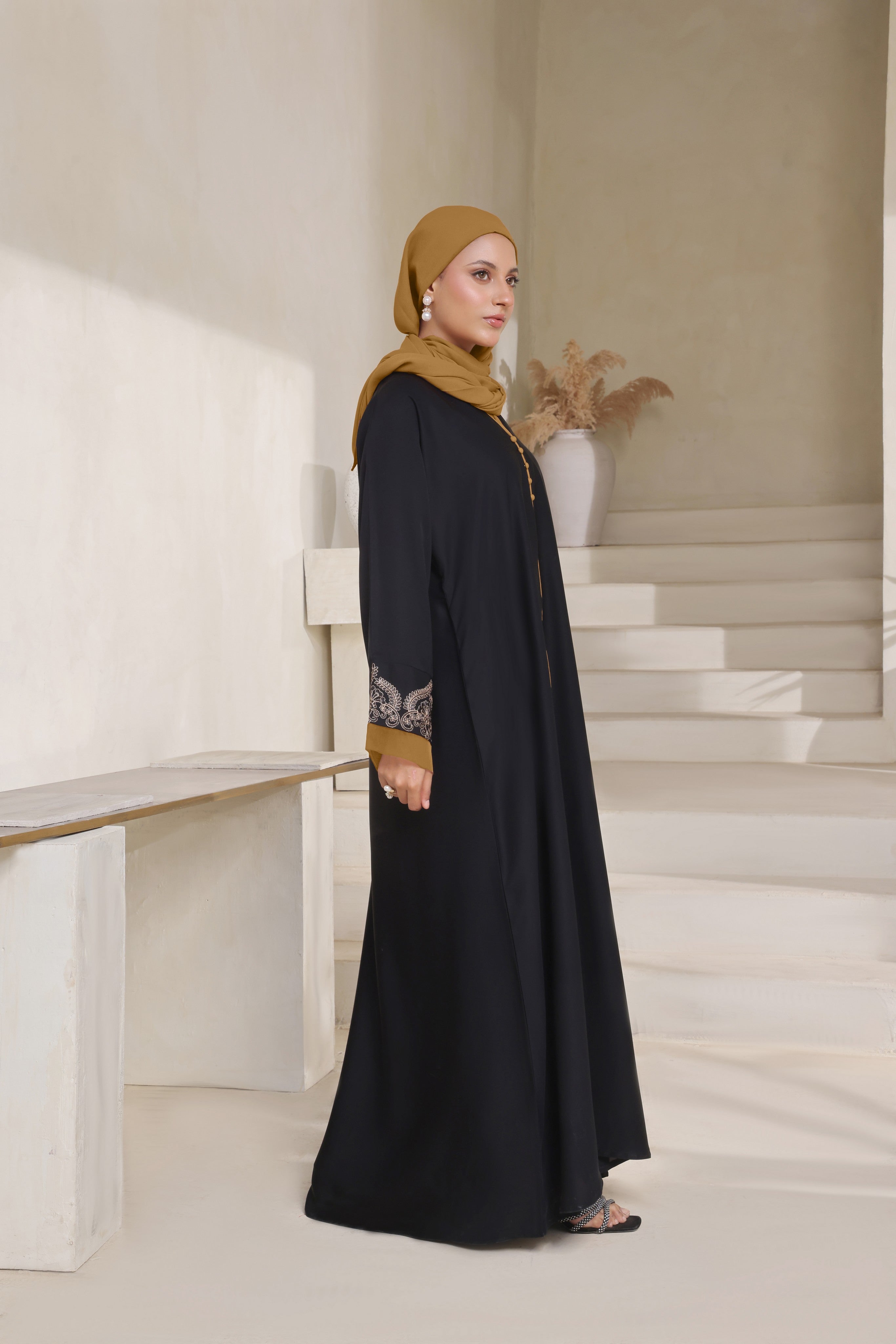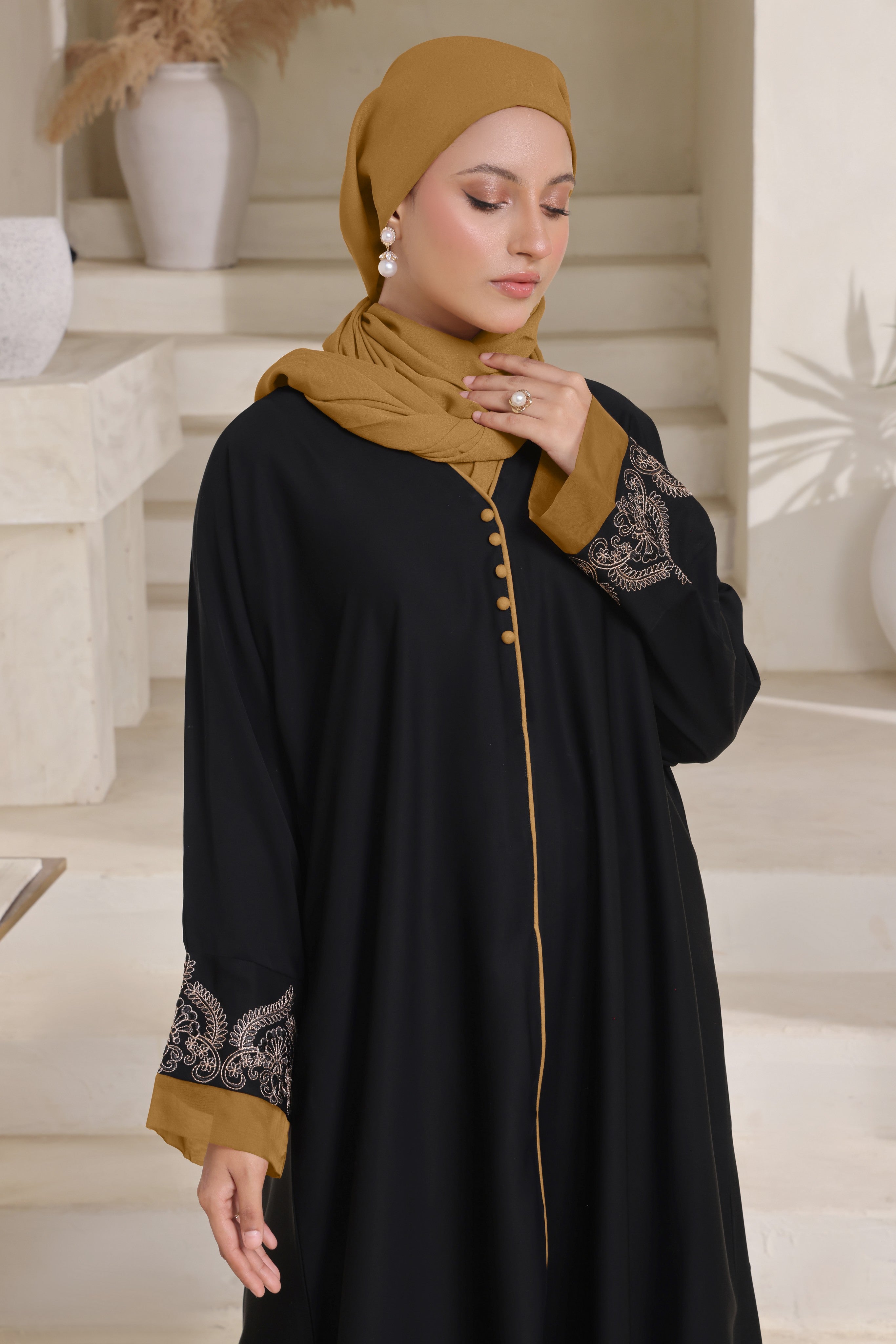 Elevate your everyday with the subtle drama and timeless charm of our Retro Black Abaya. Designed in luxurious Nidha fabric with warm contrast detailing, this abaya brings together modern structure and delicate femininity for an effortlessly refined look.
