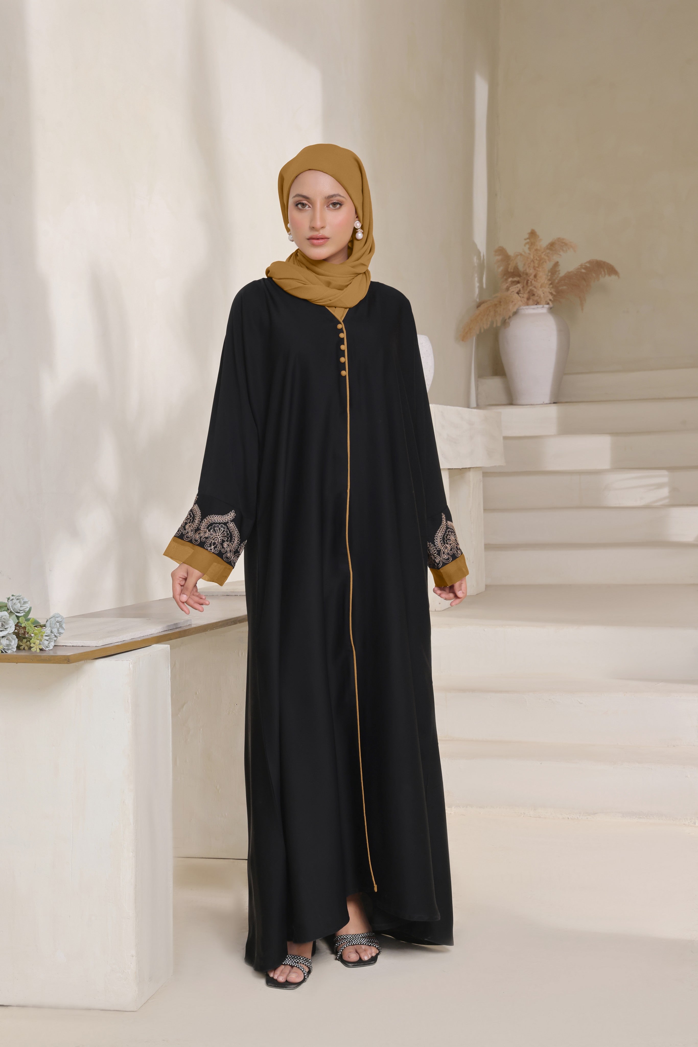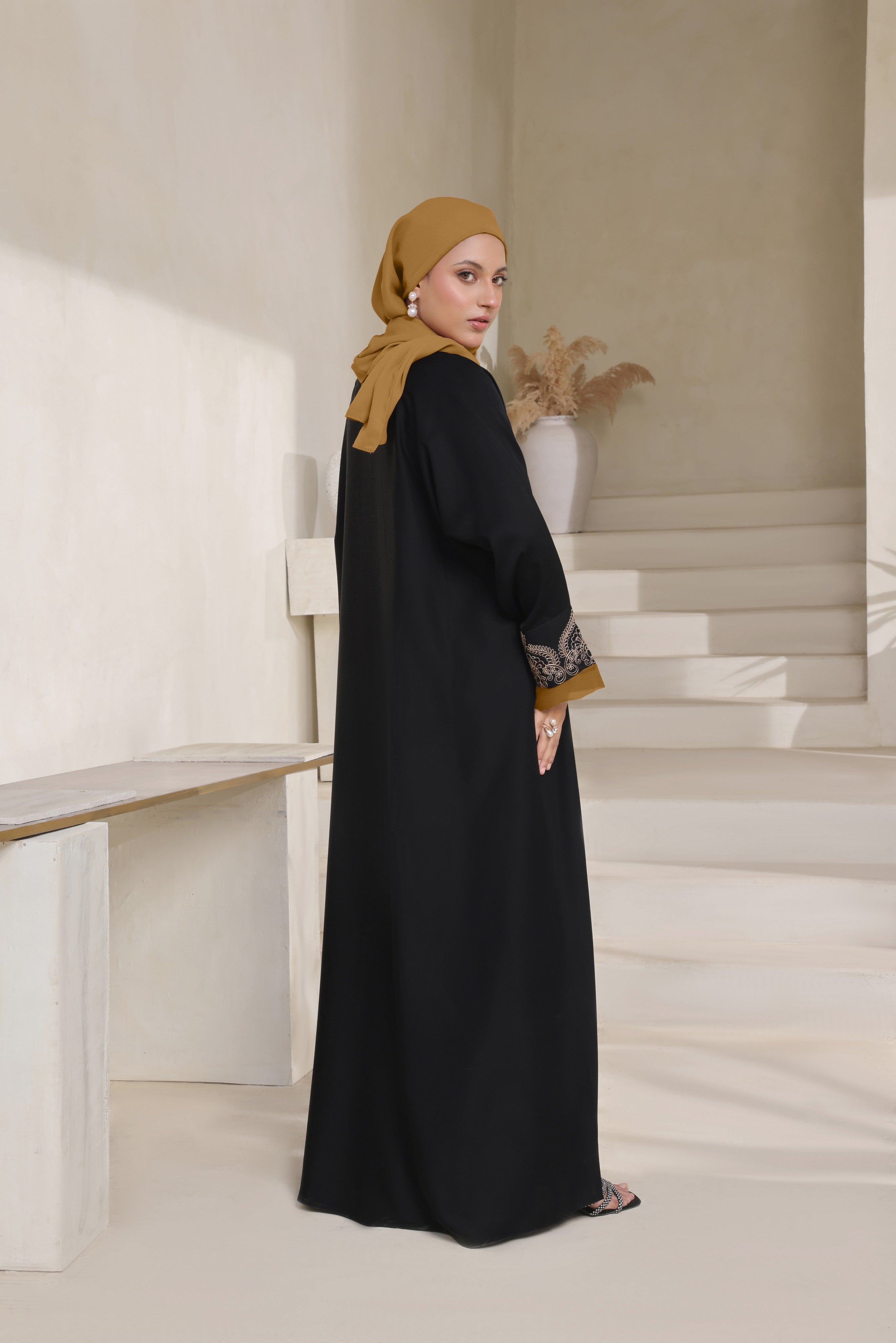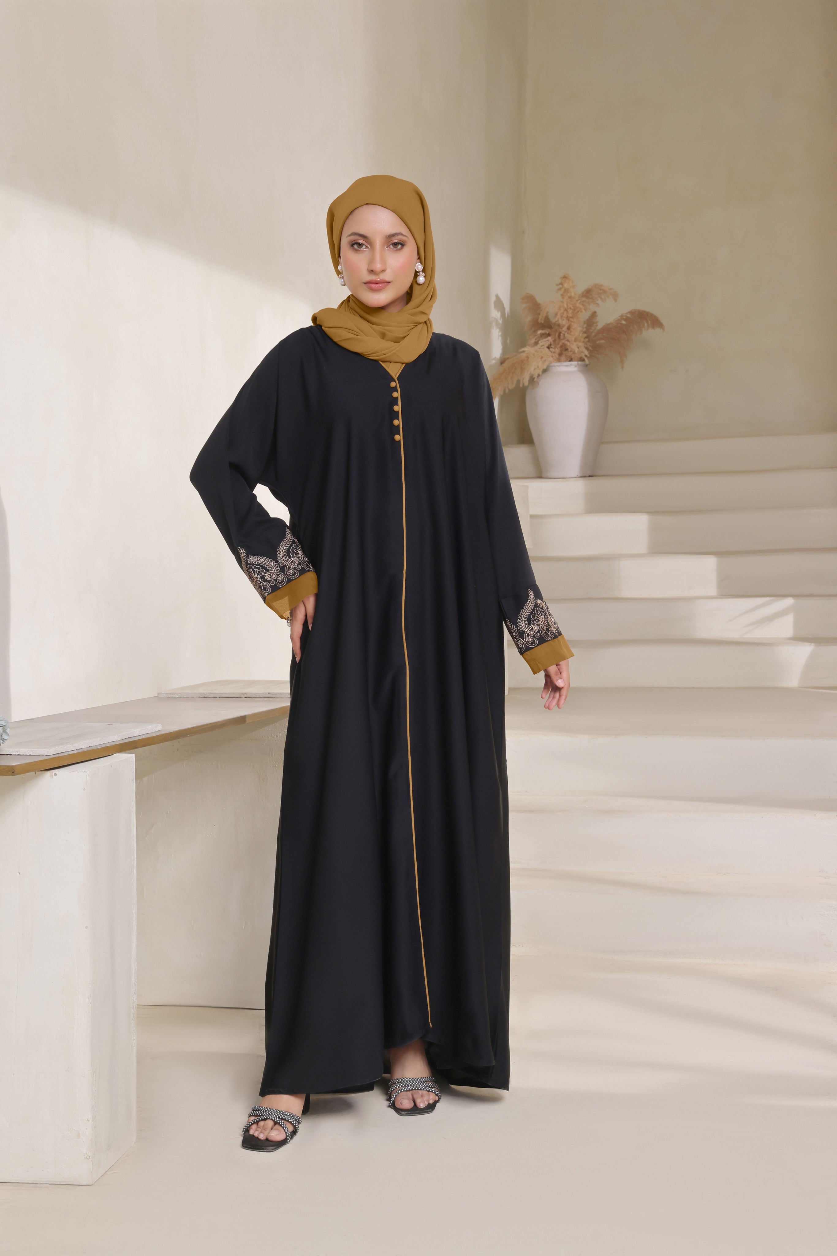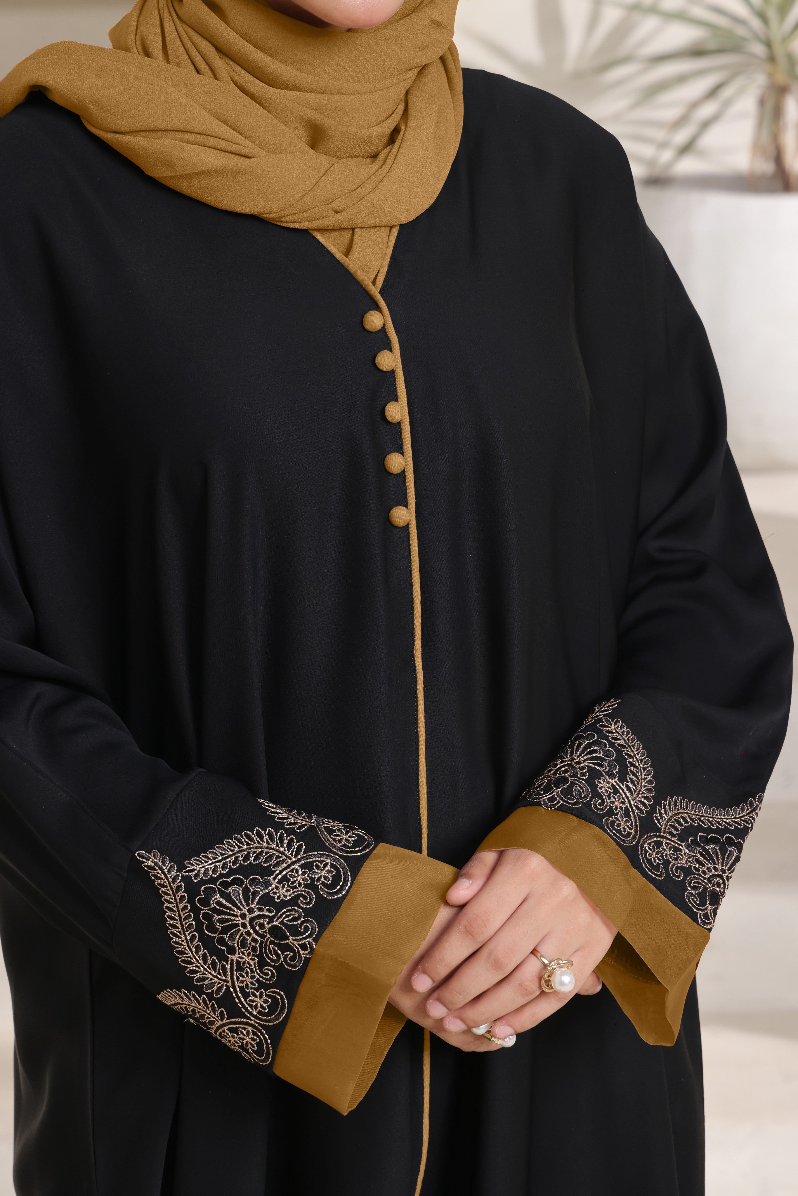 Elevate your everyday with the subtle drama and timeless charm of our Retro Black Abaya. Designed in luxurious Nidha fabric with warm contrast detailing, this abaya brings together modern structure and delicate femininity for an effortlessly refined look.