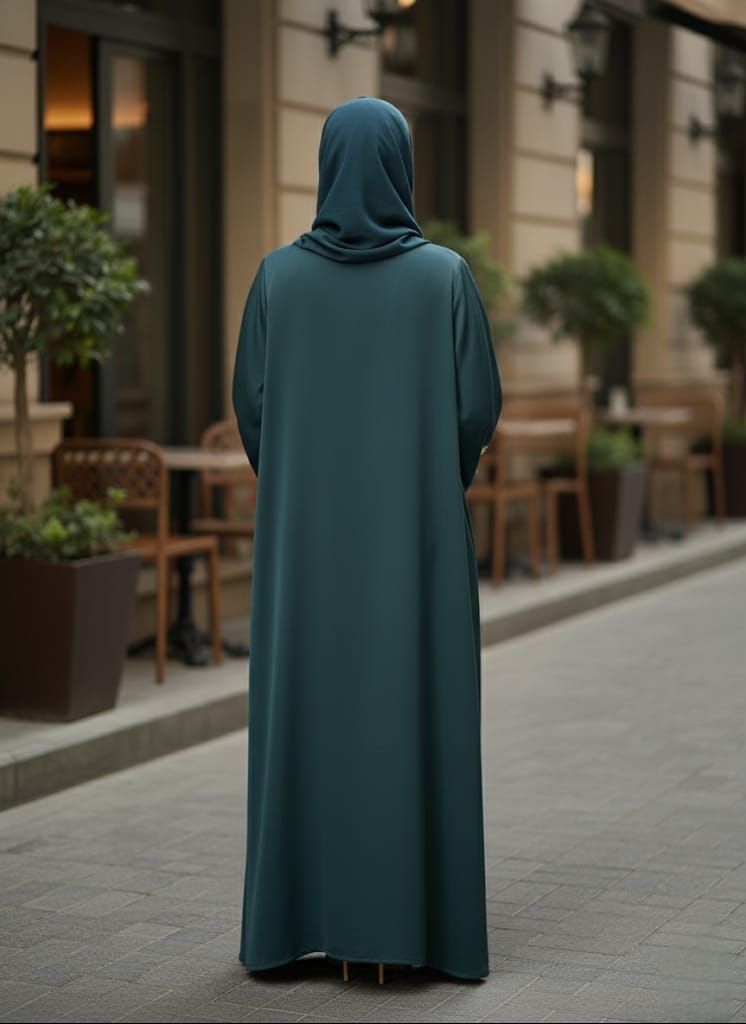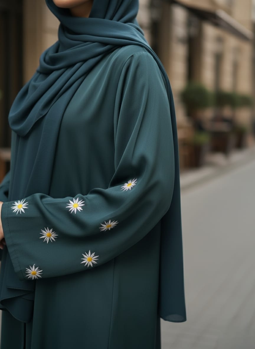 Elevate your everyday look with this teal front-open abaya, adorned with delicate floral embroidery on the sleeves. Designed in a graceful silhouette with a flowing drape, this piece combines modest fashion with understated charm. Complete with a matching hijab, it’s perfect for refined gatherings or sophisticated daywear.