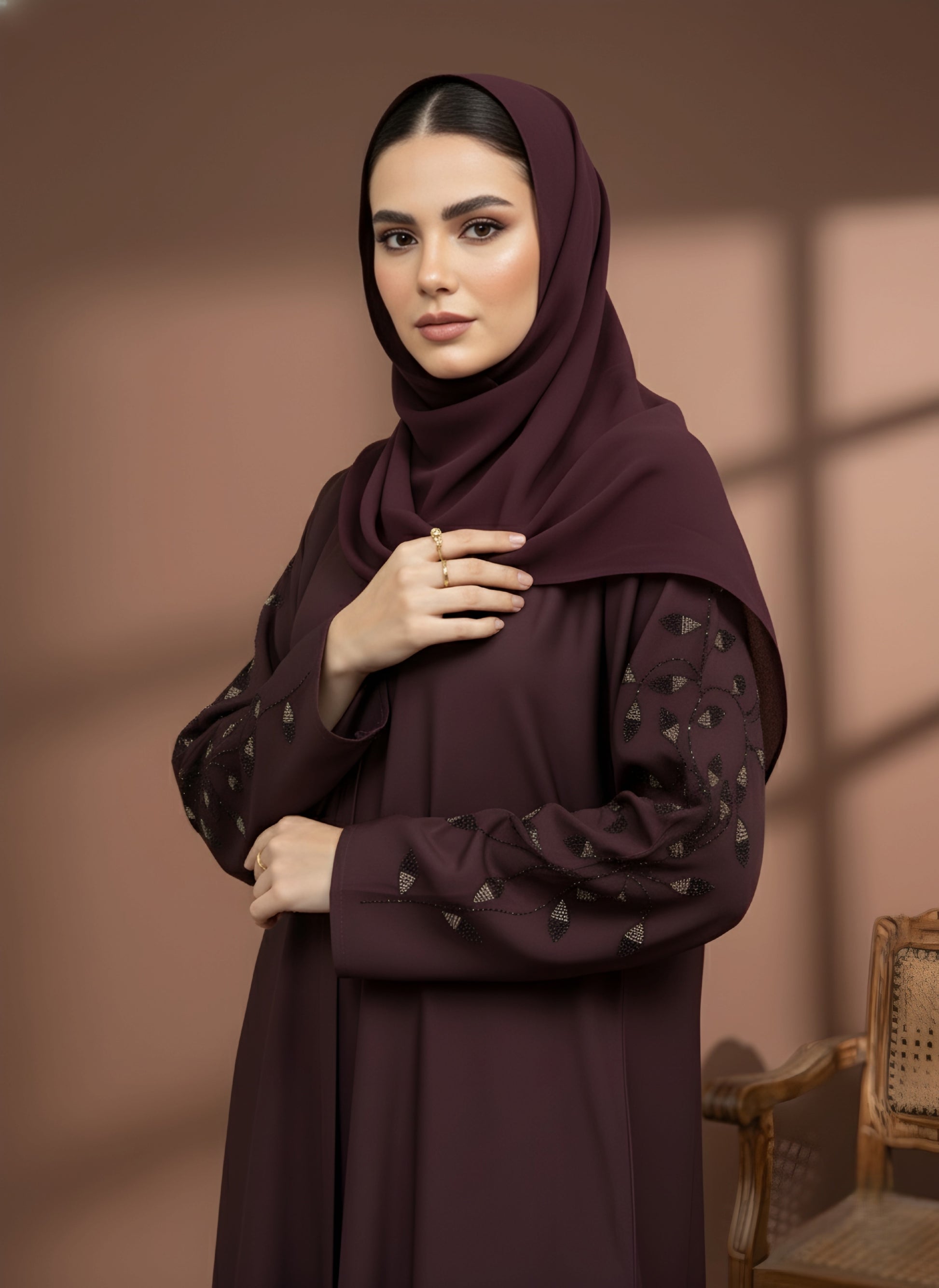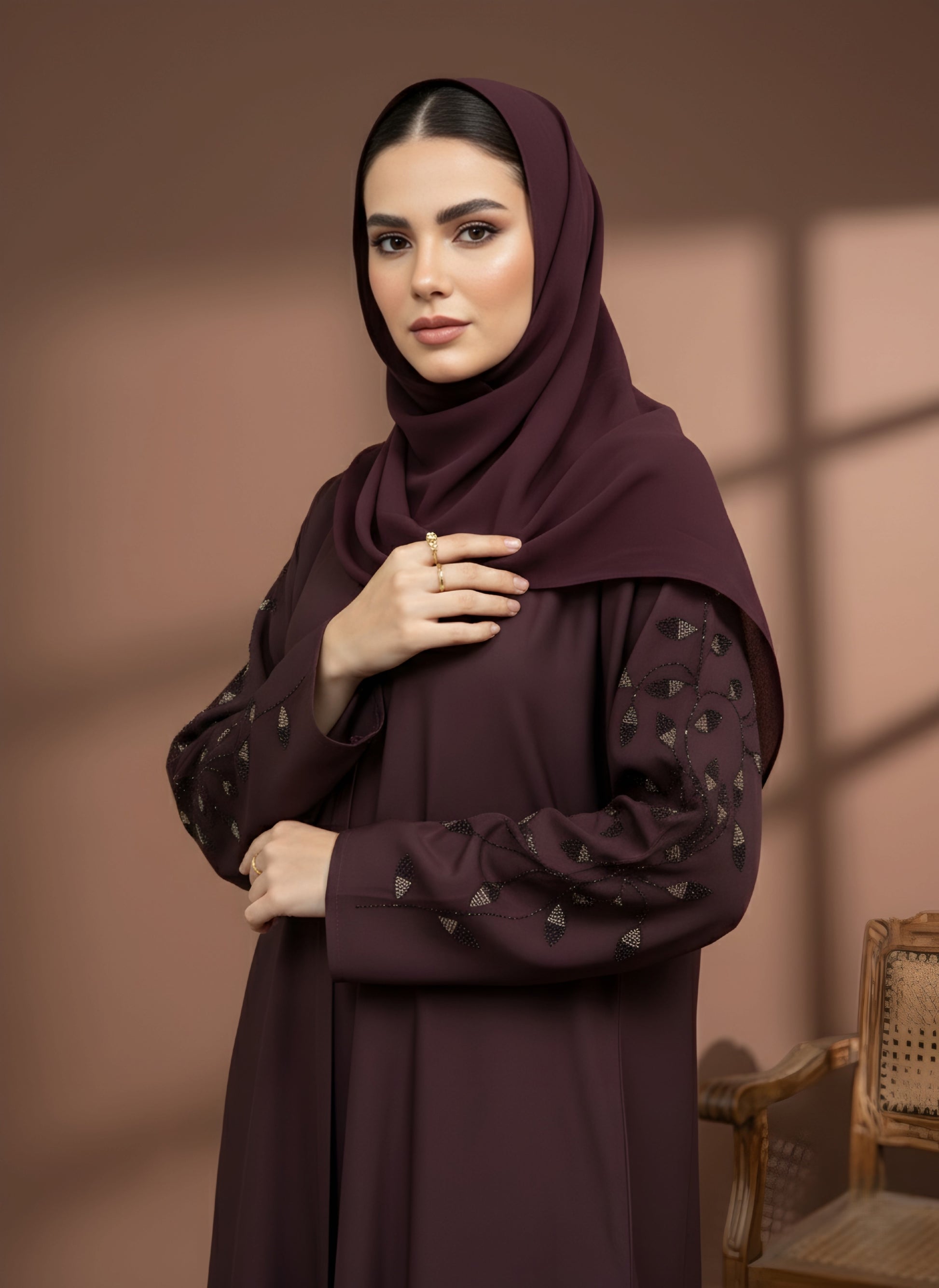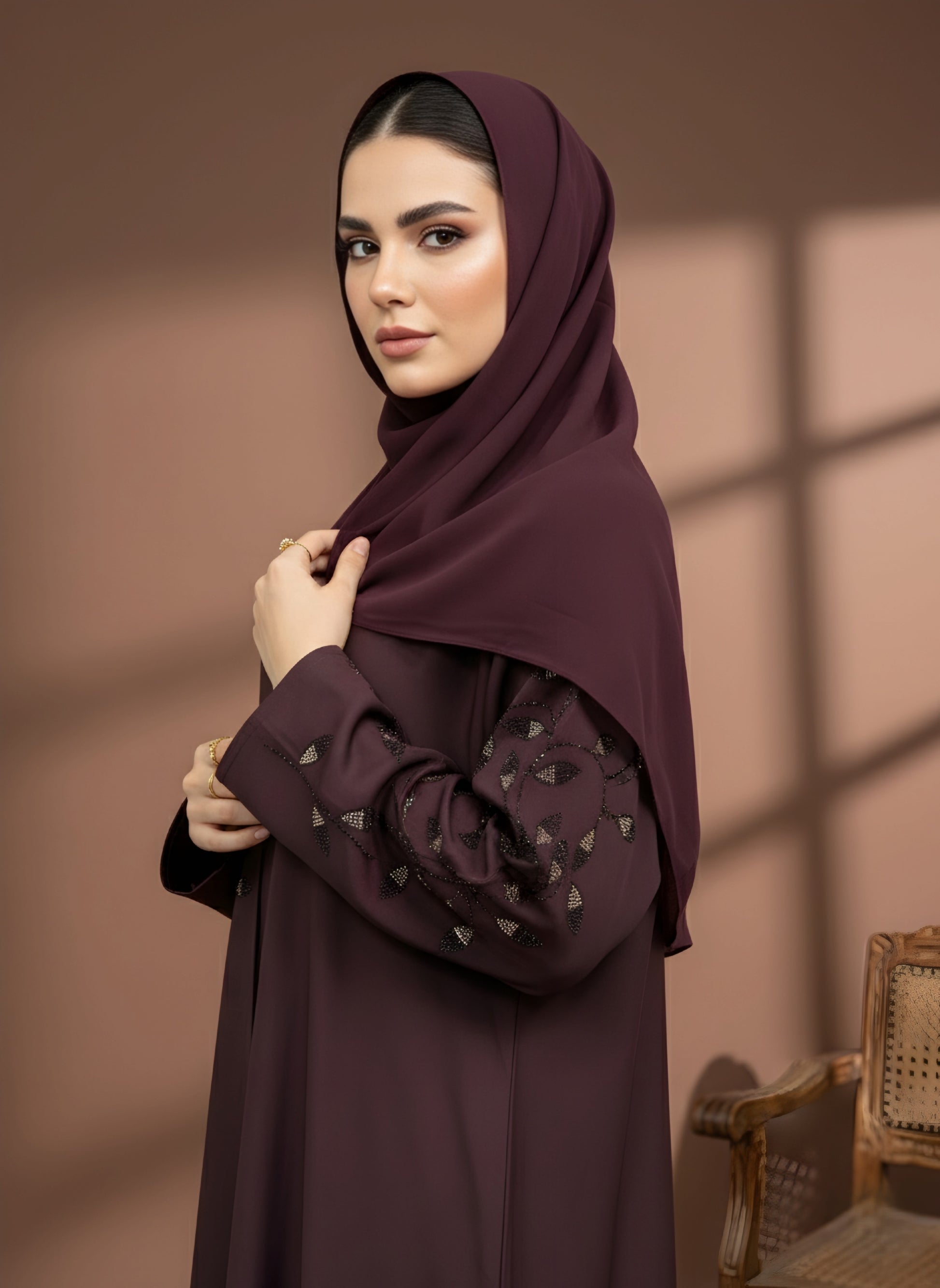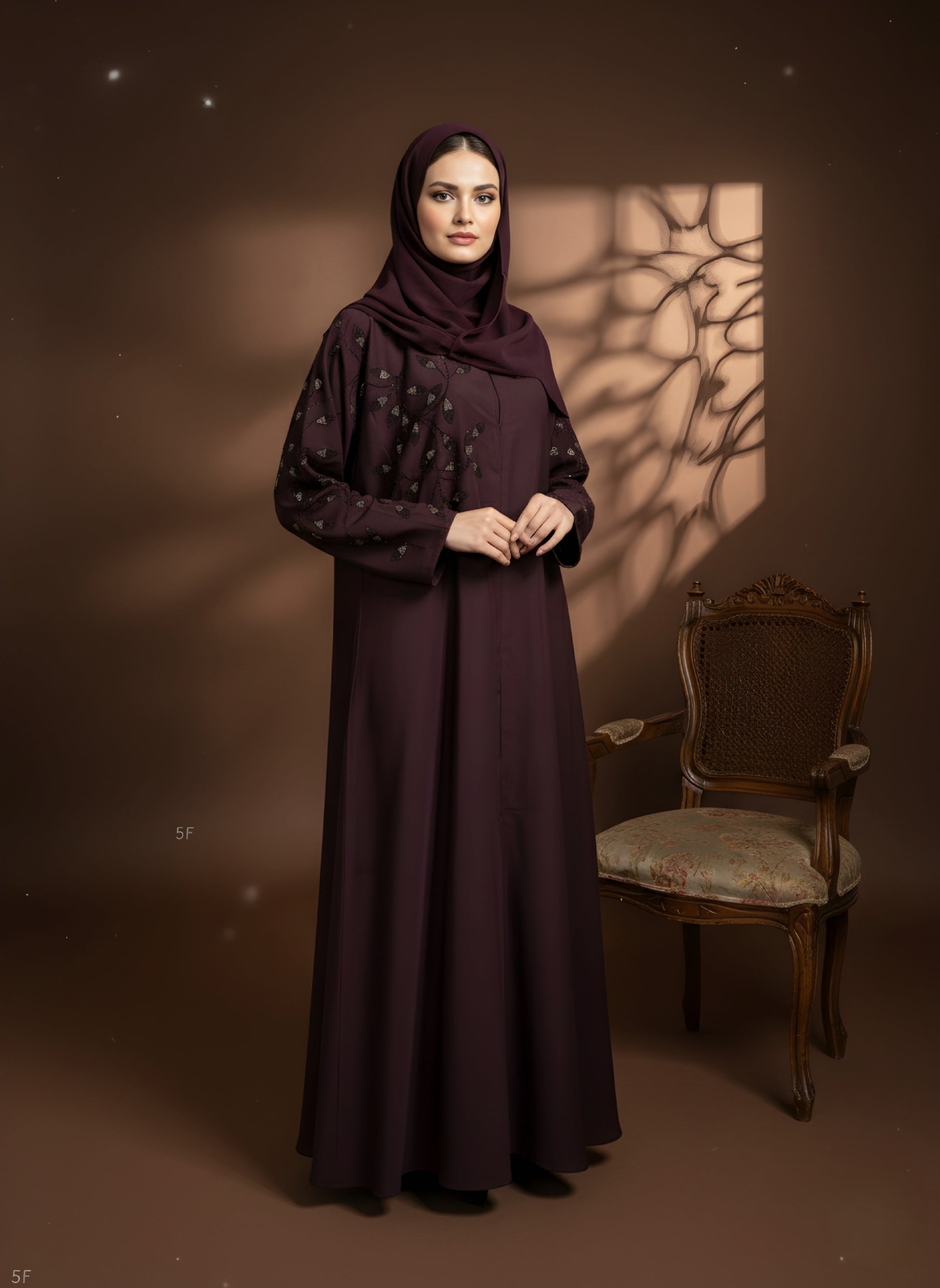 Radiate elegance from every angle with a front-open masterpiece adorned with sparkling stone work across the front, sleeves, and back. Crafted from luxurious Nidha fabric, this design offers a graceful drape and a timeless silhouette. Complete with a matching hijab, it’s the perfect choice for those who love modest wear with a touch of glamour.