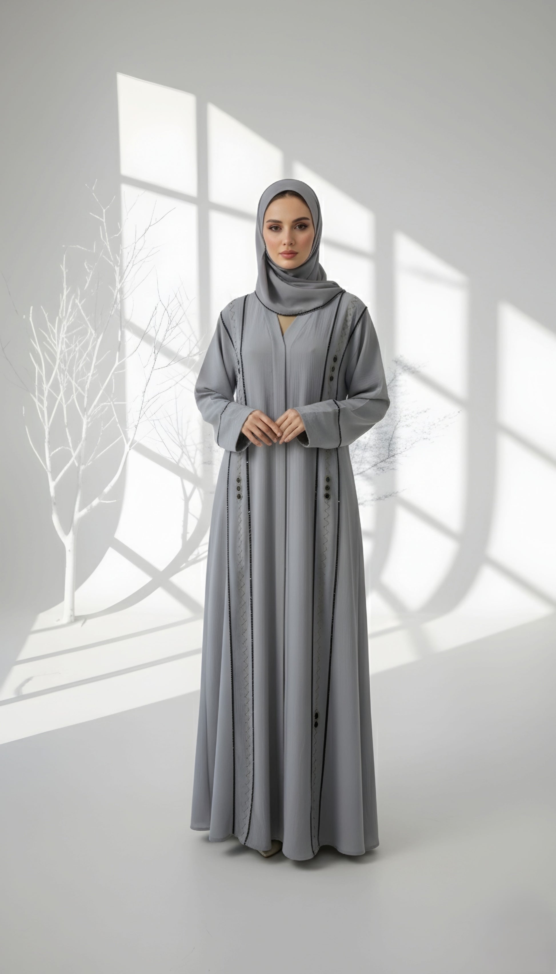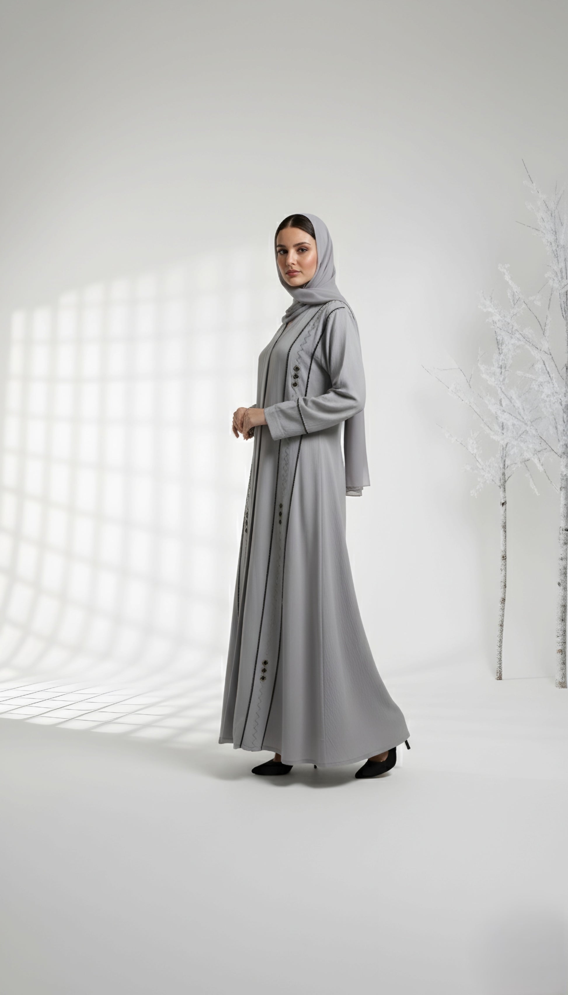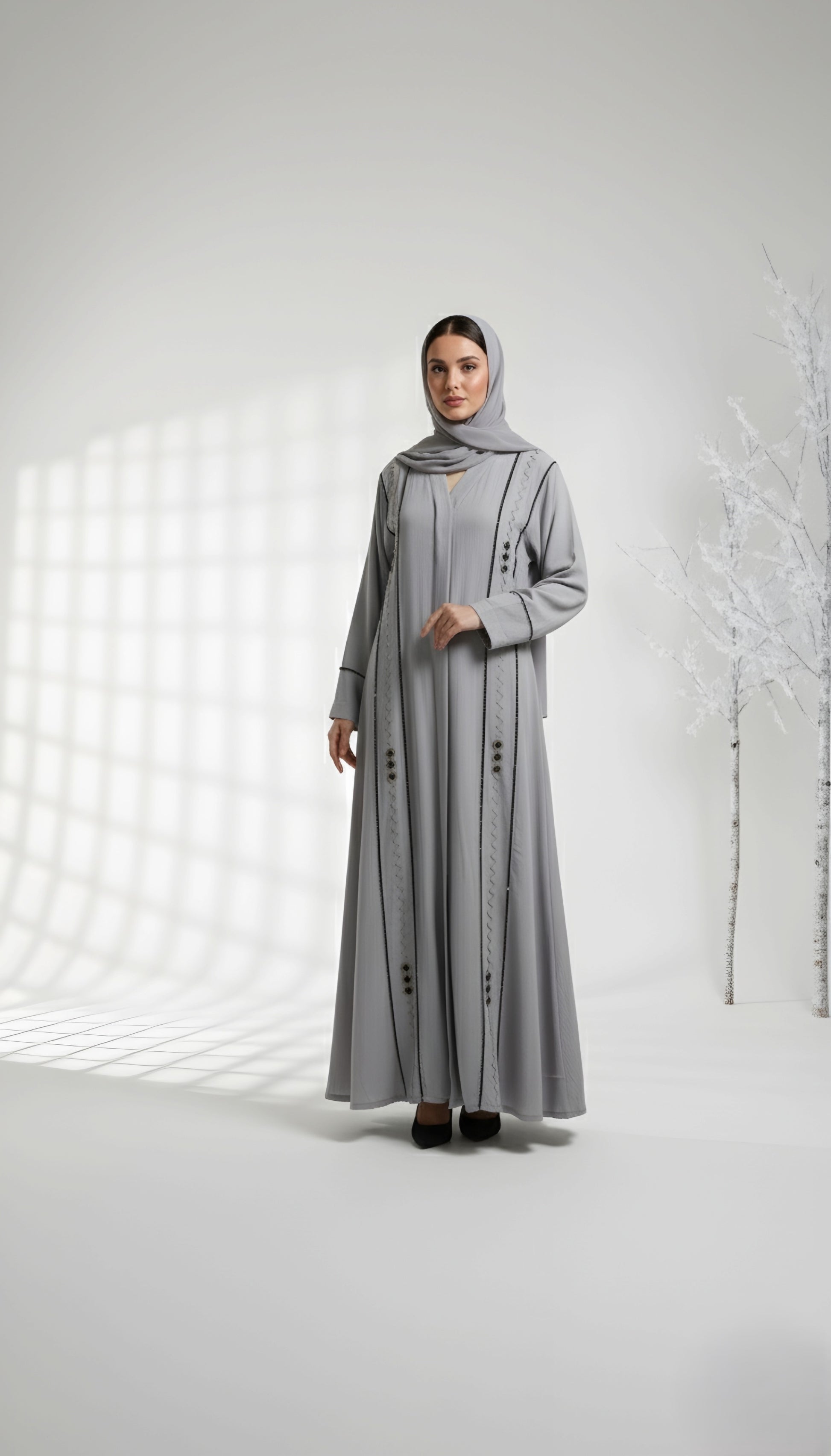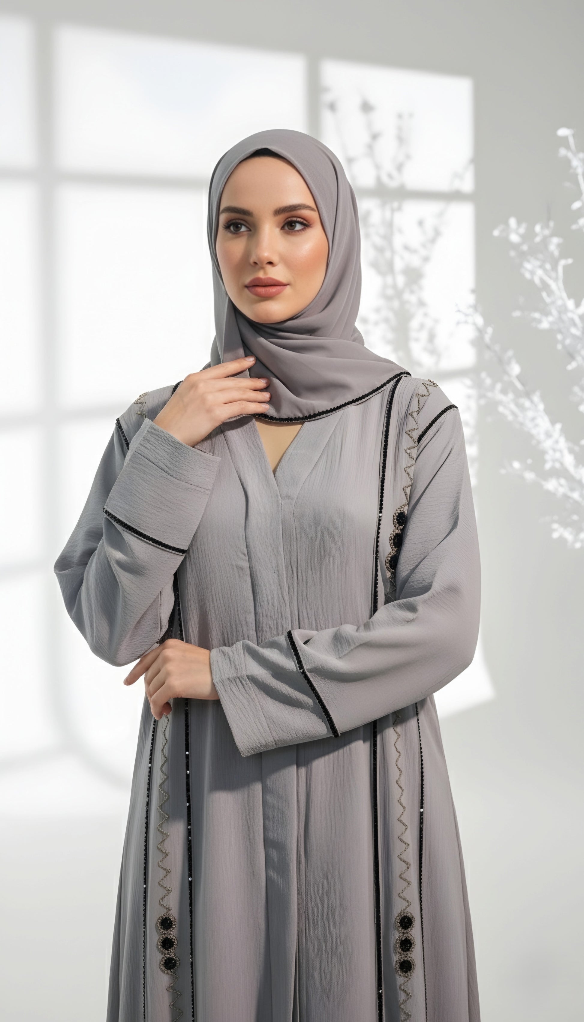 Experience timeless sophistication with Warina, a stunning dual-tone abaya designed for the modern woman who values grace and comfort. Crafted from Premium Nidha Blend, it drapes beautifully while maintaining a sleek, structured silhouette. The slate grey outer paired with a grape plum center panel creates a refined contrast — perfect for formal gatherings, festive events, or elegant evening wear.