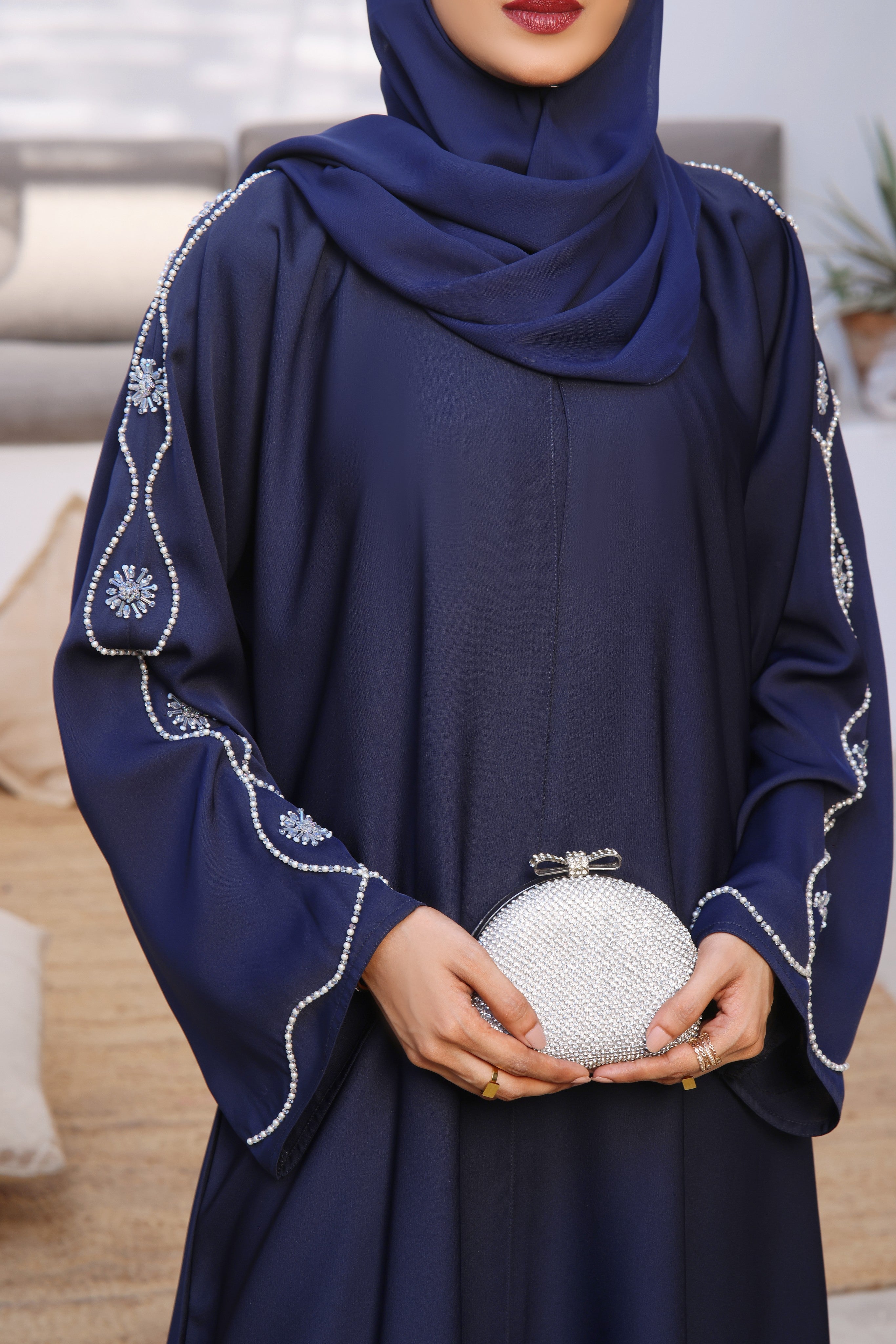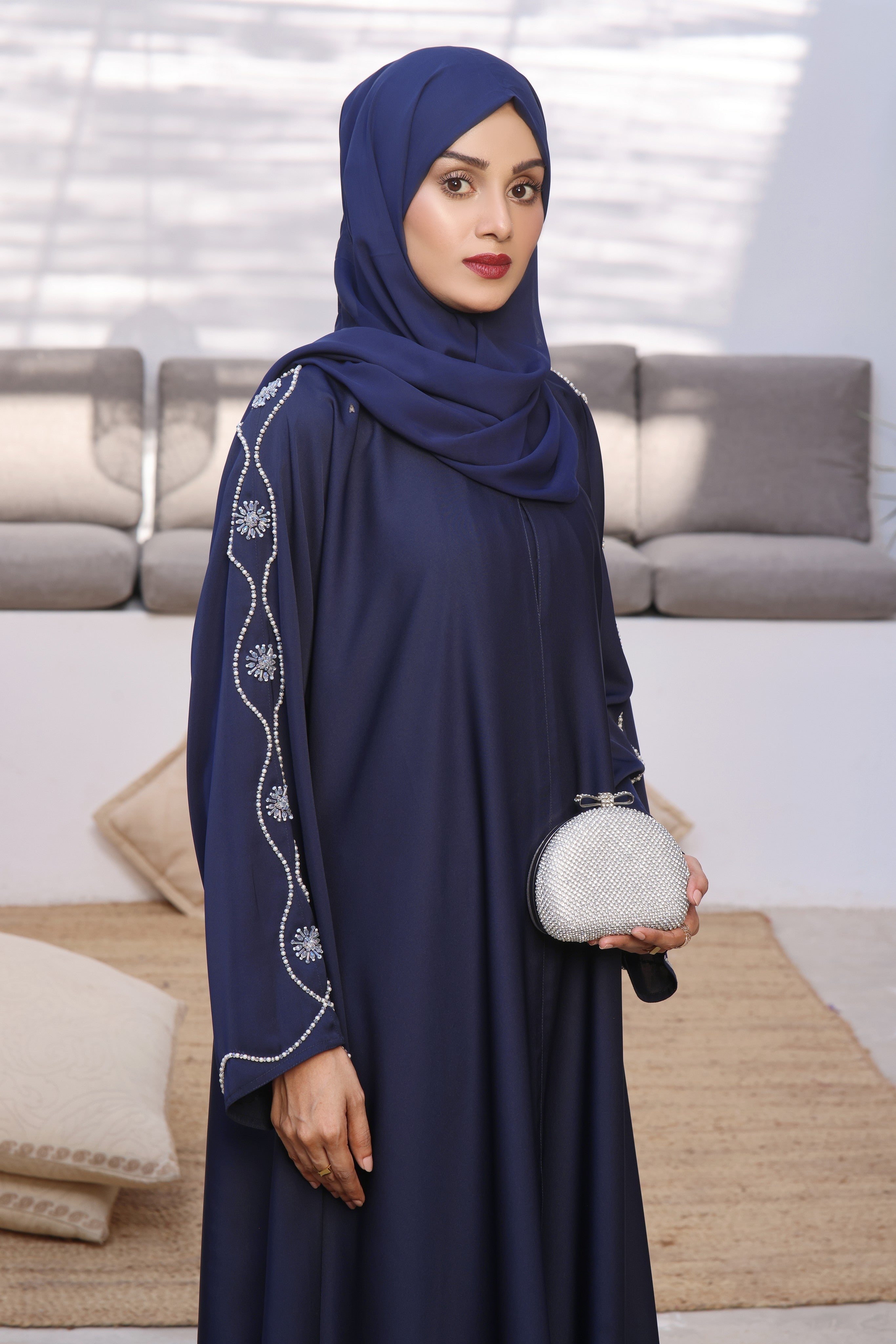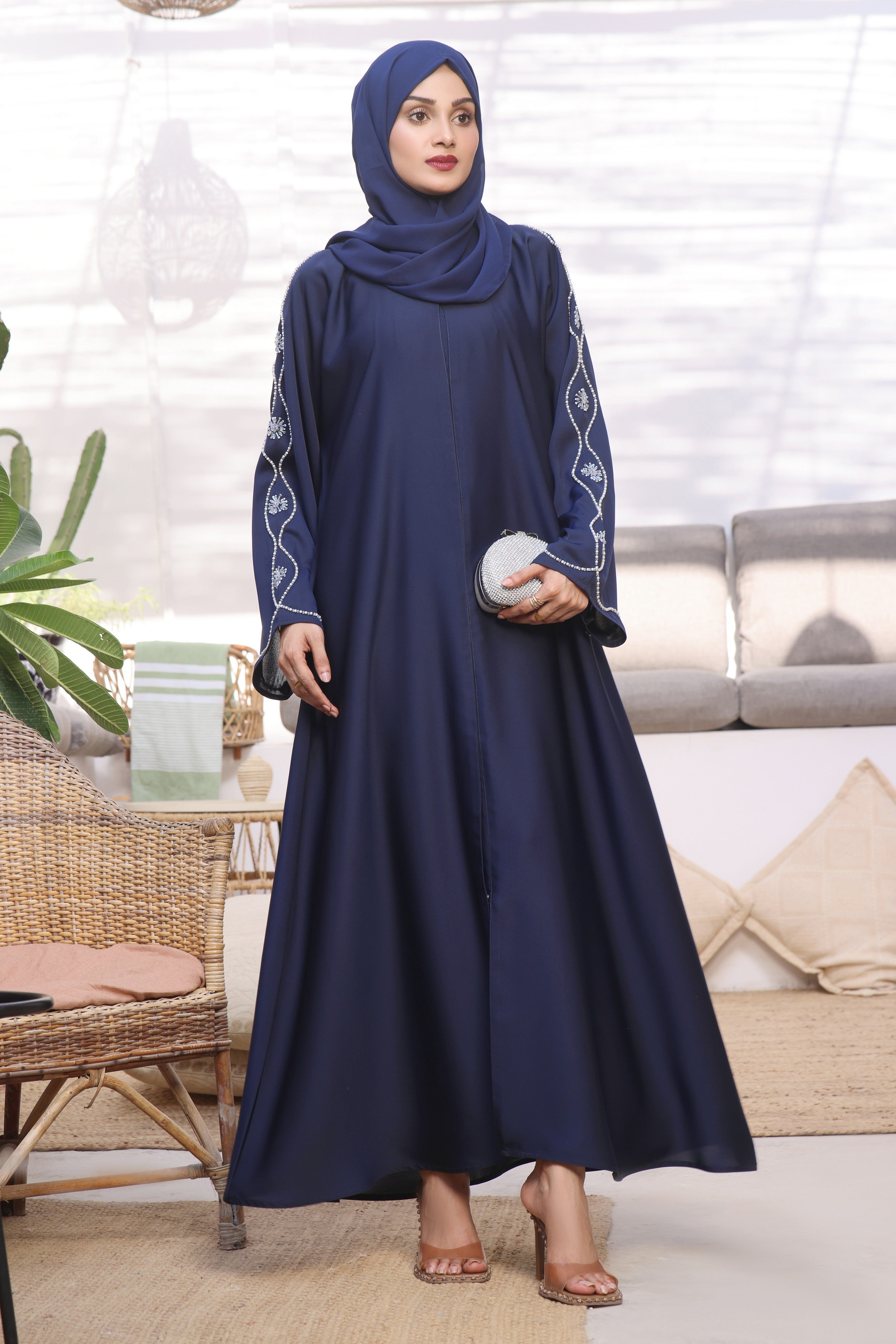 When looking for something Classy and Unique, our beautiful Flower Pearls work Abaya is gorgeous yet elegant with work on sleeves and paired with pure Korean Nidha Sheila