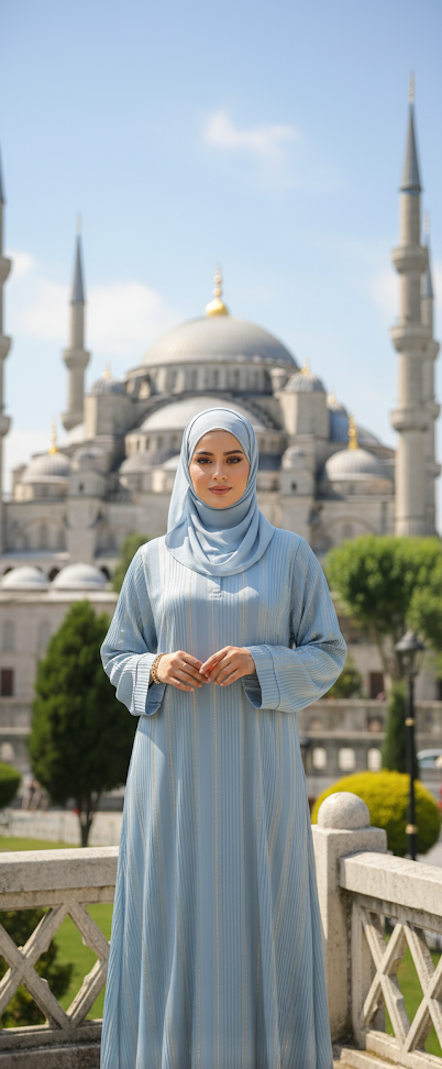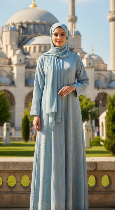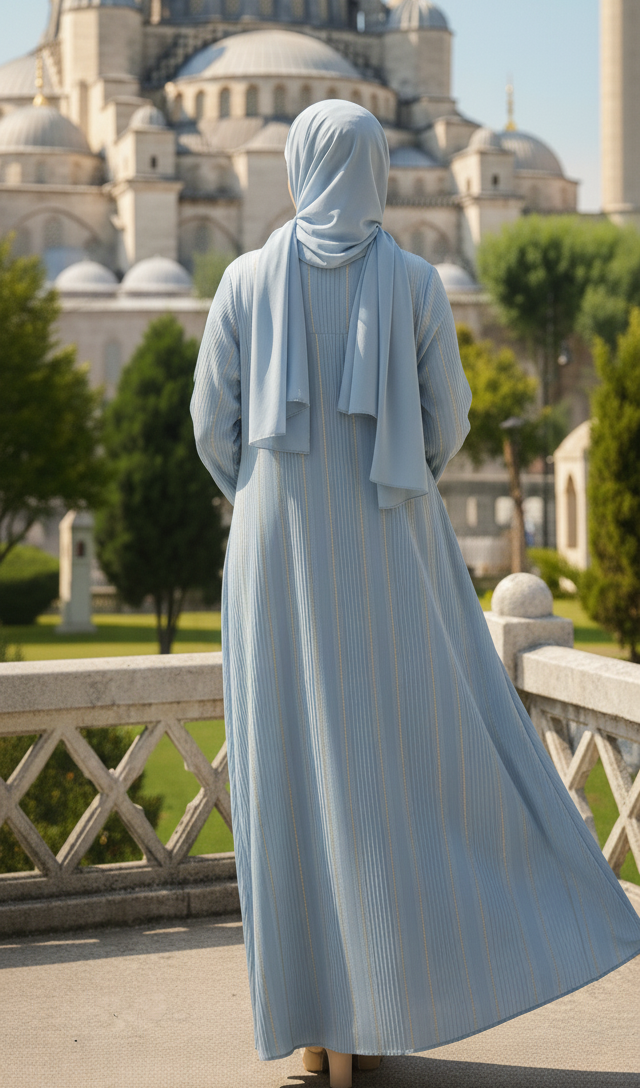Refined, radiant, and effortlessly elegant — this Blue Zari-Line Abaya is a wardrobe essential for the modern modest woman.